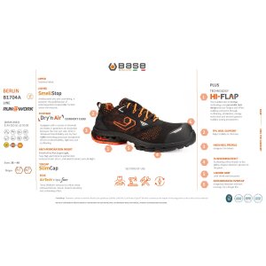 RUN@WORK Berlin work shoe with a technical fabric upper and an anti-odour and antibacterial SmellStop lining, which prevents the proliferation of microorganisms responsible for bad odours and mycosis. Featuring a new Fresh'n Flex Plus Super Light insert, resistant to perforation, which is high performance and ultralight. The SlimCap toe-cap with a thickness of only 6.5 mm is light and more comfortable than a metal toe-cap. It's AirTech+Tpu-Skin anti-fatigue sole features a reduced thickness tread which offers greater elasticity and provides a lasting cushioning effect.