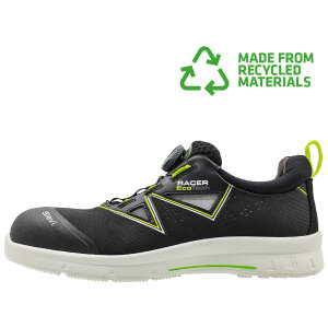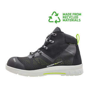 I ankelskorna Racer EcoTech H har användningen av återvunnet material maximerats. Skyddsskorna har ett tåskydd av aluminium och ett spiktrampskydd av textil. Ovandelen andas mycket bra och tål slitage tack vare sin vävda textilstruktur. Snörningsmekanismen Sievi FastLace® gör att det går snabbt och bekvämt att ta på skorna. Inläggssulan Sievi Green Comfort ökar komforten.