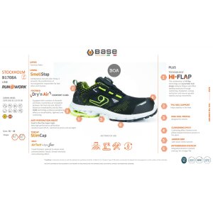 RUN@WORK Stockholm arbetssko med ovandel i tekniskt tyg och ett antibakteriellt SmellStop-foder, som förhindrar spridning av mikroorganismer som orsakar dålig lukt och svampangrepp. Med den nya Fresh'n Flex Plus Super Light-insatsen, som är motståndskraftig mot perforering, högpresterande och ultralätt. SlimCap-tåhätta med en tjocklek på endast 6,5 mm är lätt och bekvämare än en tåhätta i metall. Den slitstarka AirTech+Tpu-Skin-sulan har en slitbana med reducerad tjocklek som ger större elasticitet och en varaktig dämpningseffekt.