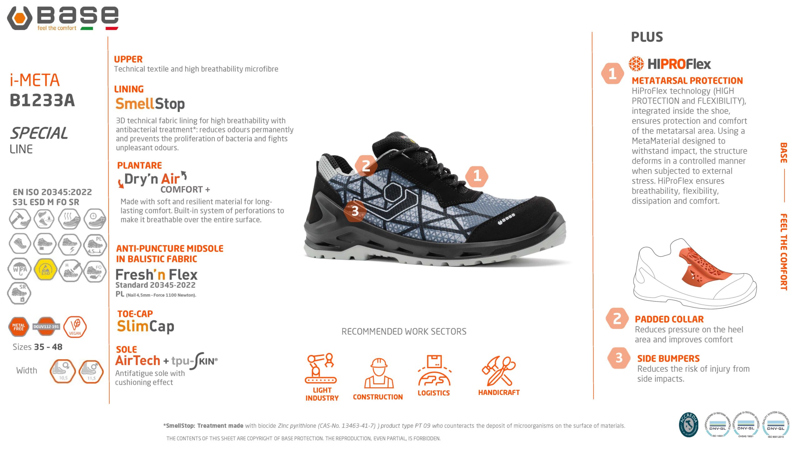 Water-resistant texthile; SmellStop lining; puncture-resistant Sole and SlimCap toe-cap;sole AirTech + Tpu skin – Metel Free ESD