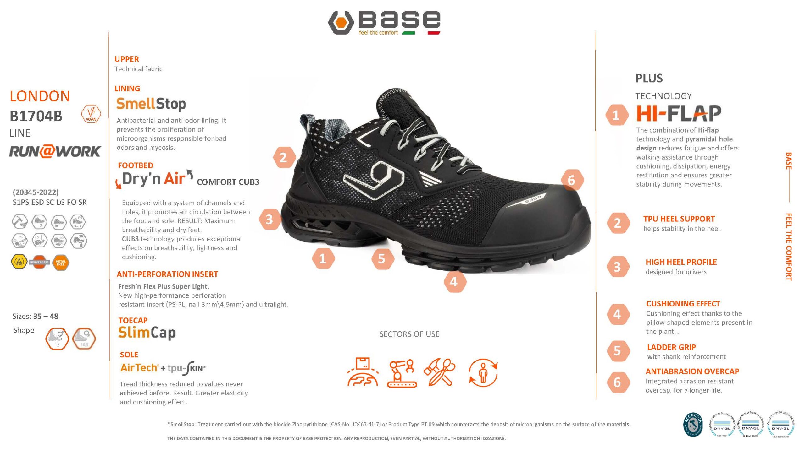 RUN@WORK London work shoe with a technical fabric upper and an anti-odour and antibacterial SmellStop lining, which prevents the proliferation of microorganisms responsible for bad odours and mycosis. Featuring a new Fresh’n Flex Plus Super Light insert, resistant to perforation, which is high performance and ultralight. The SlimCap toe-cap with a thickness of only 6.5 mm is light and more comfortable than a metal toe-cap. It’s AirTech+Tpu-Skin anti-fatigue sole features a reduced thickness tread which offers greater elasticity and provides a lasting cushioning effect.