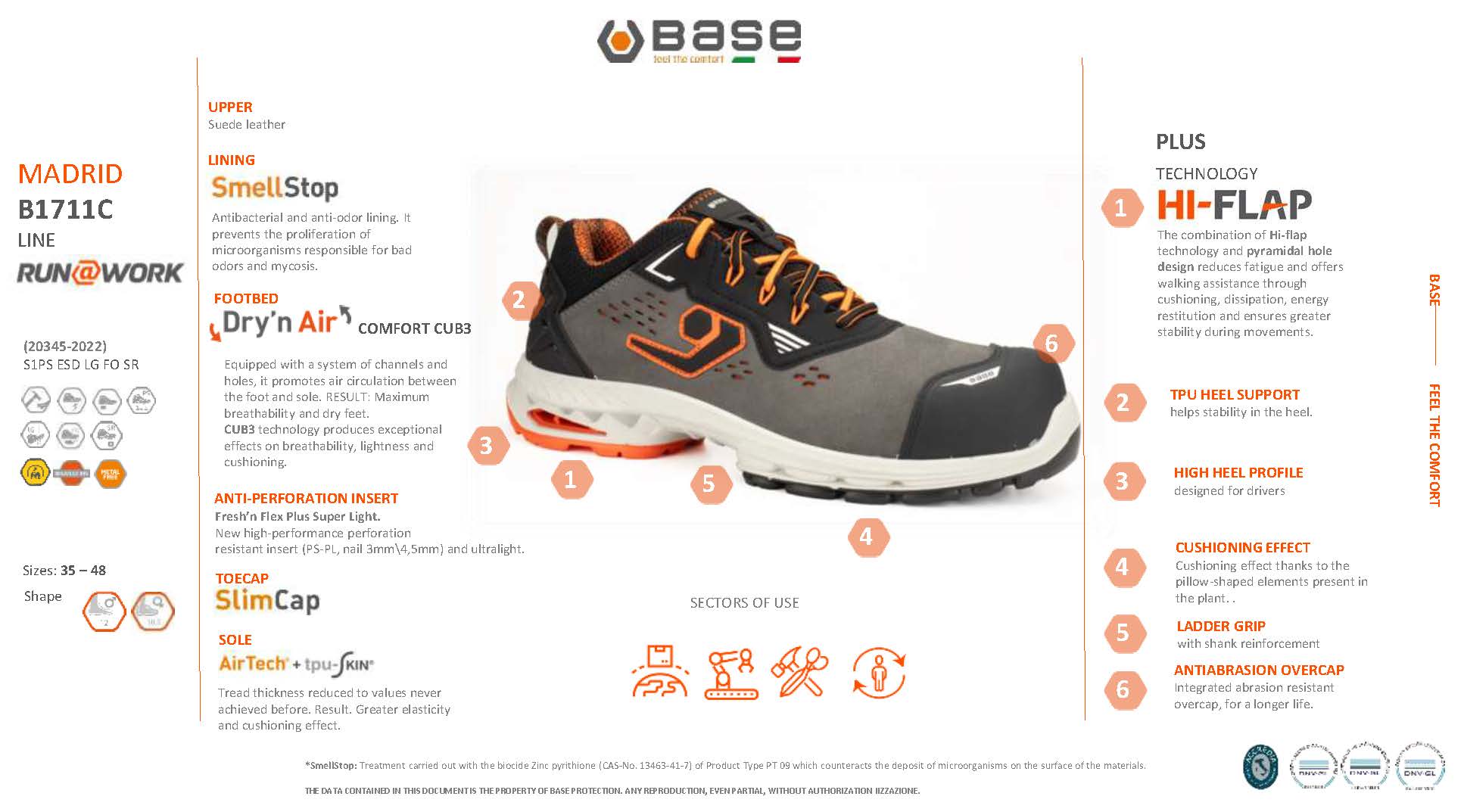 RUN@WORK Madrid work shoe with a suede leather upper and an anti-odour and antibacterial SmellStop lining, which prevents the proliferation of microorganisms responsible for bad odours and mycosis. Featuring a new Fresh’n Flex Plus Super Light insert, resistant to perforation, which is high performance and ultralight. The SlimCap toe-cap with a thickness of only 6.5 mm is light and more comfortable than a metal toe-cap. It’s AirTech+Tpu-Skin anti-fatigue sole features a reduced thickness tread which offers greater elasticity and provides a lasting cushioning effect.