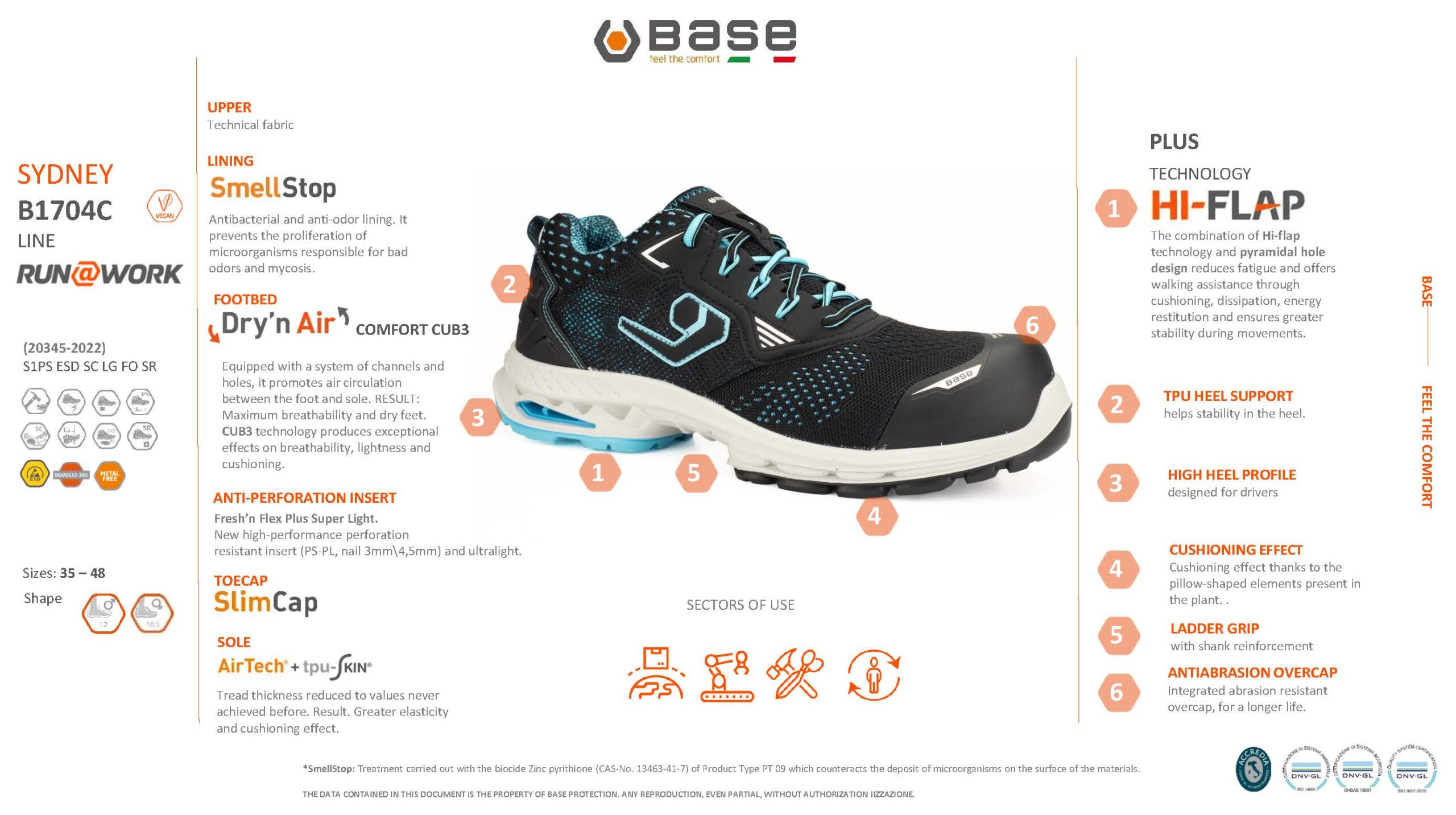 RUN@WORK Sydney work shoe with a technical fabric upper and an anti-odour and antibacterial SmellStop lining, which prevents the proliferation of microorganisms responsible for bad odours and mycosis. Featuring a new Fresh’n Flex Plus Super Light insert, resistant to perforation, which is high performance and ultralight. The SlimCap toe-cap with a thickness of only 6.5 mm is light and more comfortable than a metal toe-cap. It’s AirTech+Tpu-Skin anti-fatigue sole features a reduced thickness tread which offers greater elasticity and provides a lasting cushioning effect.