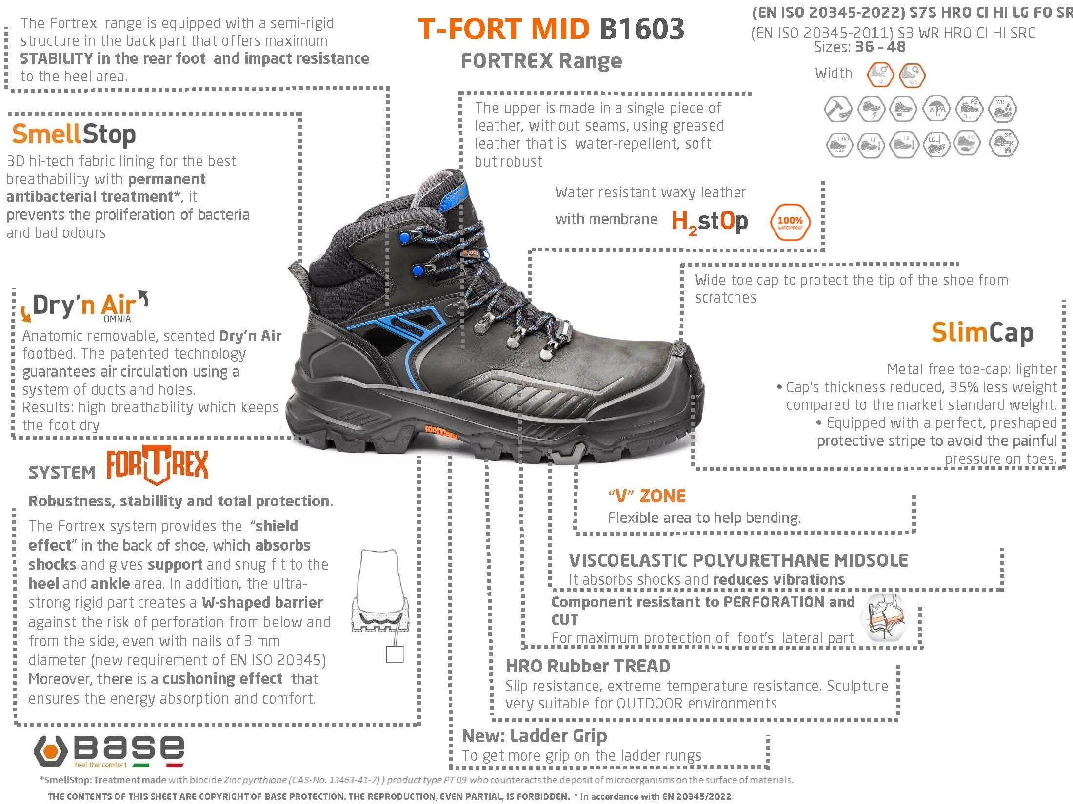 WR S3 HRO CI HI LG FO SR Ankle shoe, water resistant Nubuck leather; SmellStop lining, Fortrex puncture resistant patent + Dry’n Air footbed; SlimCap toe-cap; Fortrex sole Pu + Rubber