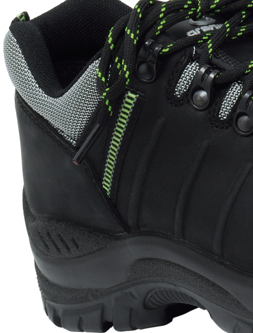 Skyddssko, spiktrampskyddsmaterial stål, tåhättematerial komposit, mellansula i PU, plastgelänk, slitsula i PU, ovandelsmaterial nubuck