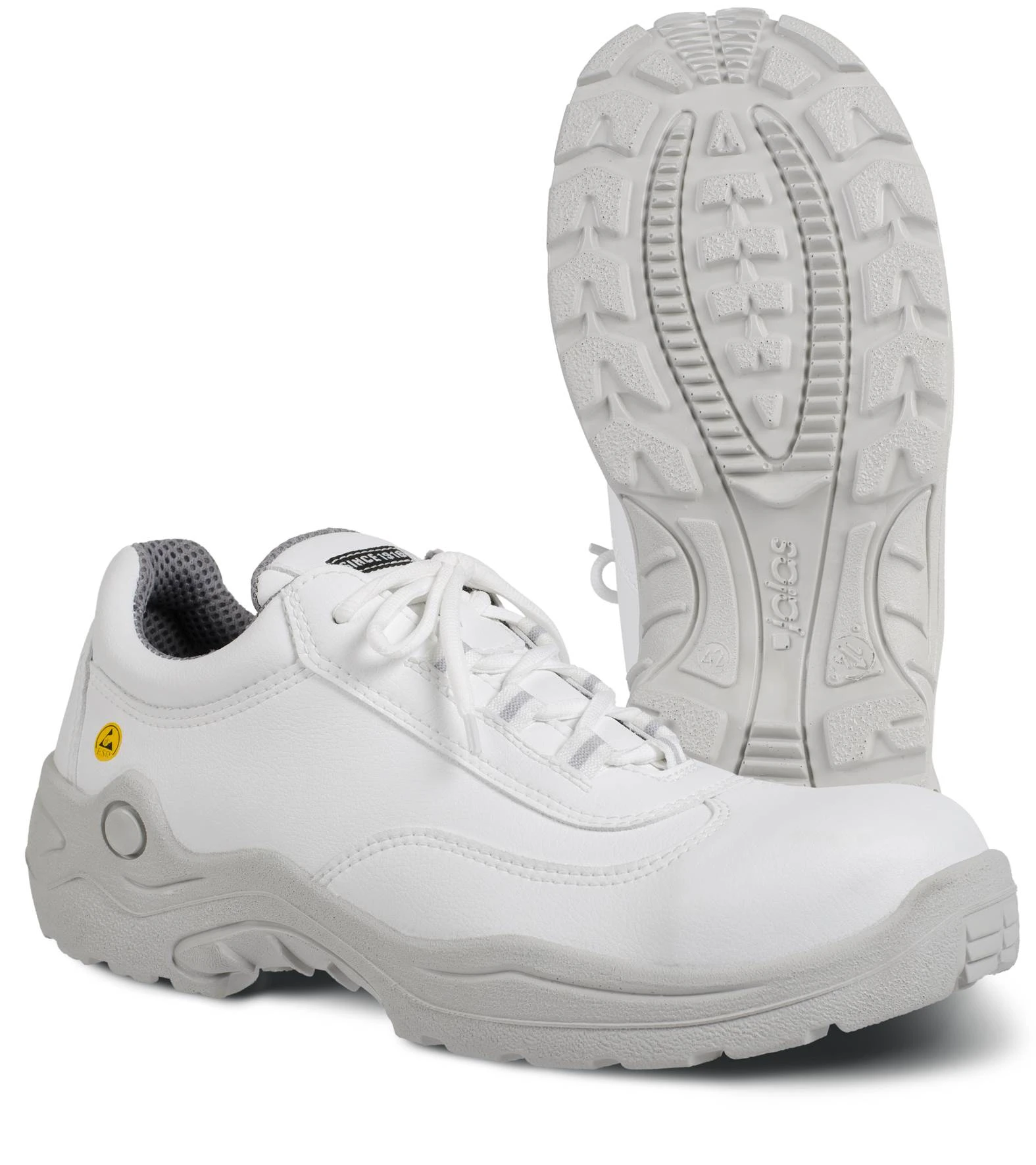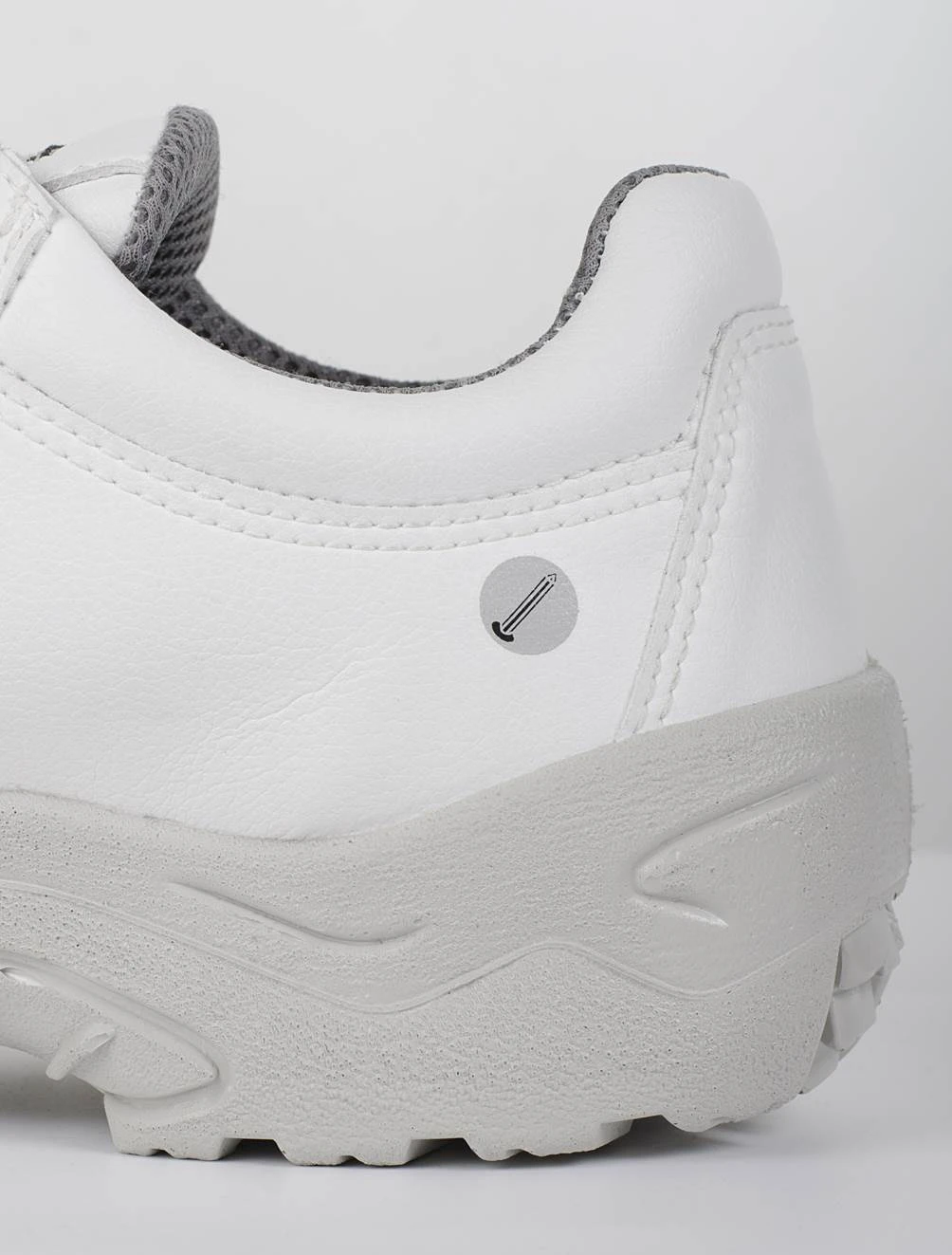 Vit, lätt och veganvänlig skyddssko helt utan metall och animaliskt skinn, med tåhätta i komposit och spiktrampskydd i plasmabehandlad komposit (PTC). Denna mycket bekväma sko har högsta kvalitetsnivå på skydd, extremt bra grepp, utmärkt passform och extra bra stötdämpning.