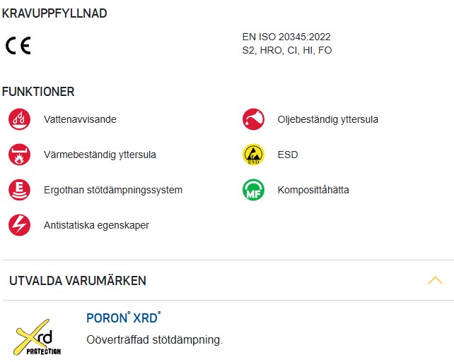 - Huvudsakliga användningsmiljöer: Utomhus, inomhus, året runt-bruk, krav på metallfria skor, varma ytor, hala miljöer, rena miljöer, fuktiga miljöer, oljiga miljöer, smutsiga miljöer