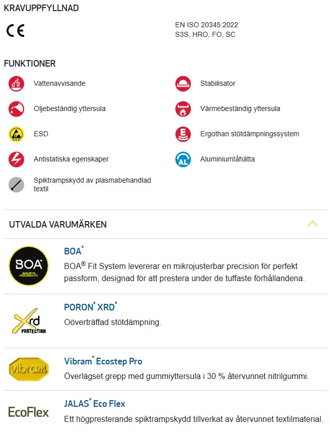 Det som utmärker Jalas är kombinationen av avancerat skydd, ergonomisk design och överlägsen komfort. Skorna utvecklas för att klara de tuffaste arbetsmiljöerna och erbjuder lösningar för allt från bygg- och industribranschen till logistik och serviceyrken.