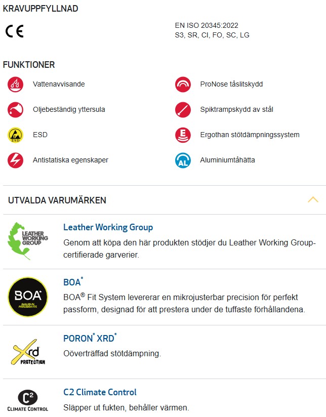 - Motverkar risk för: Tåskador, spikpenetration, vrickningsskador, antistatiska risker, halkning, belastningsskador