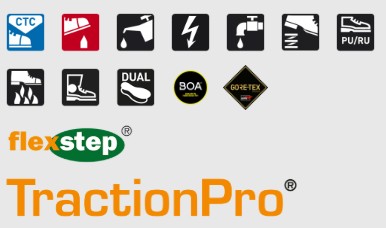 Skyddsskon har ett viskoelastiskt ankelskydd av memory foam som stöd för ankeln. GORE-TEX är ett vattentätt fodermaterial som låter foten andas, men som samtidigt håller fukten utanför skon. Skons utmärkta grepp och slittålighet har säkerställts med friktionssulan Sievi TractionPro®, vars sportiga profil tillhandahåller grepp och stötdämpning, speciellt till fotens stödområden.