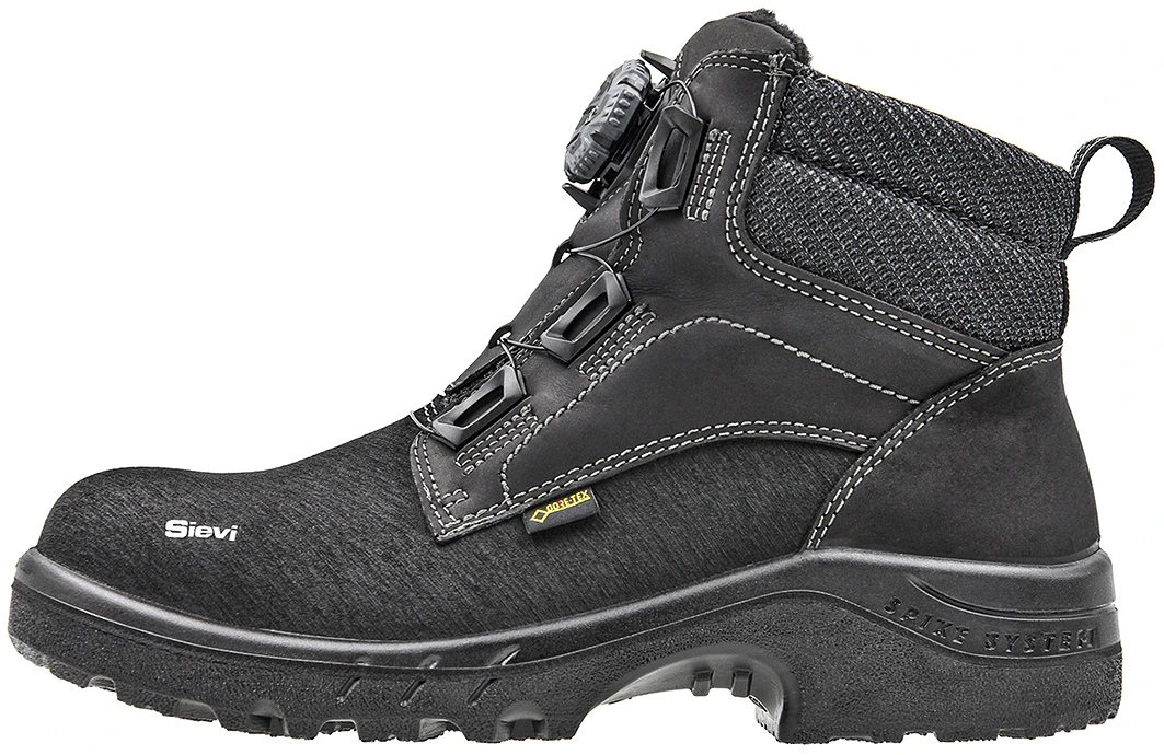 Sievi Spike®-skorna har en patenterad dubbmekanism integrerad i sulan som gör att man enkelt vrider dubbarna ut och in utan att behöva ta av skorna. Dubbarna ger bra grepp på snö- och vattentäckta ytor, vilket gör dem till överlägsna skyddsskor i vinterförhållanden. Skorna har ett vattentätt GORE-TEX-membran som andas och snörningsmekanismen BOA® Fit System.