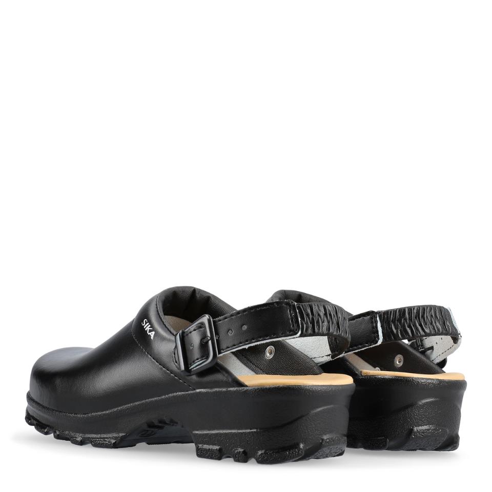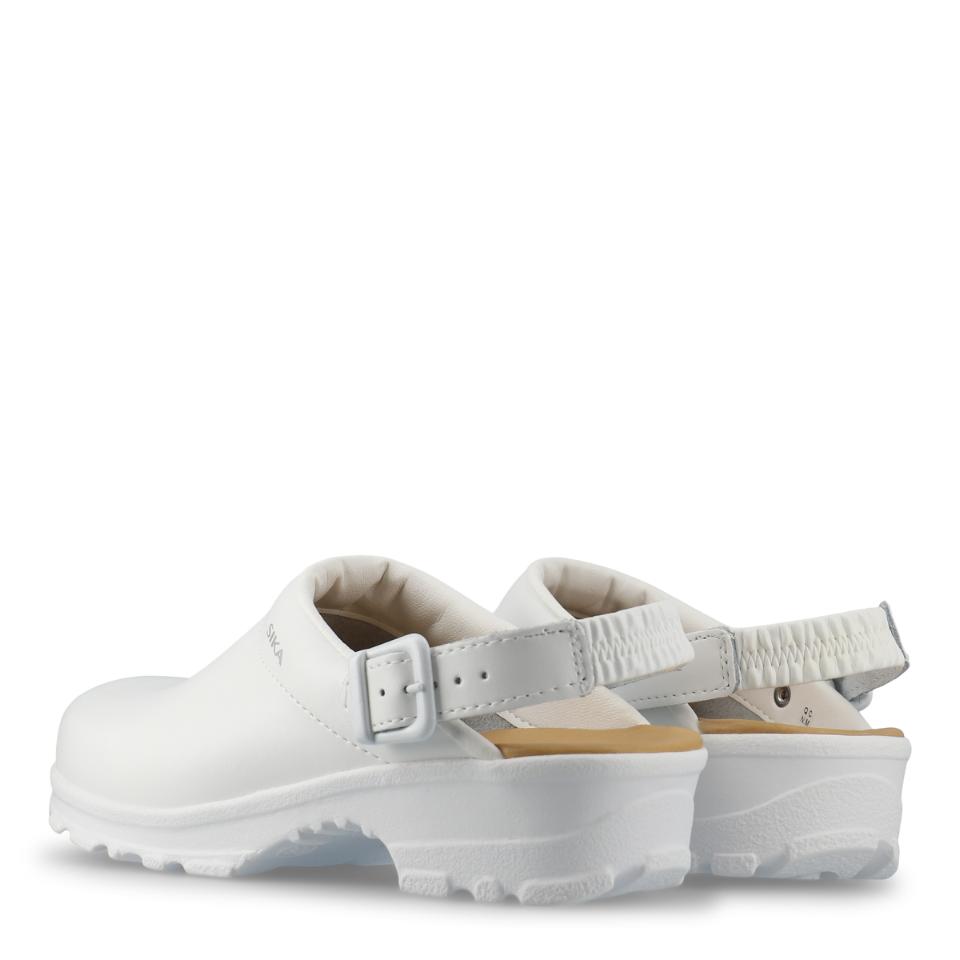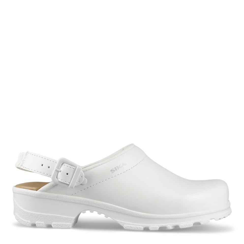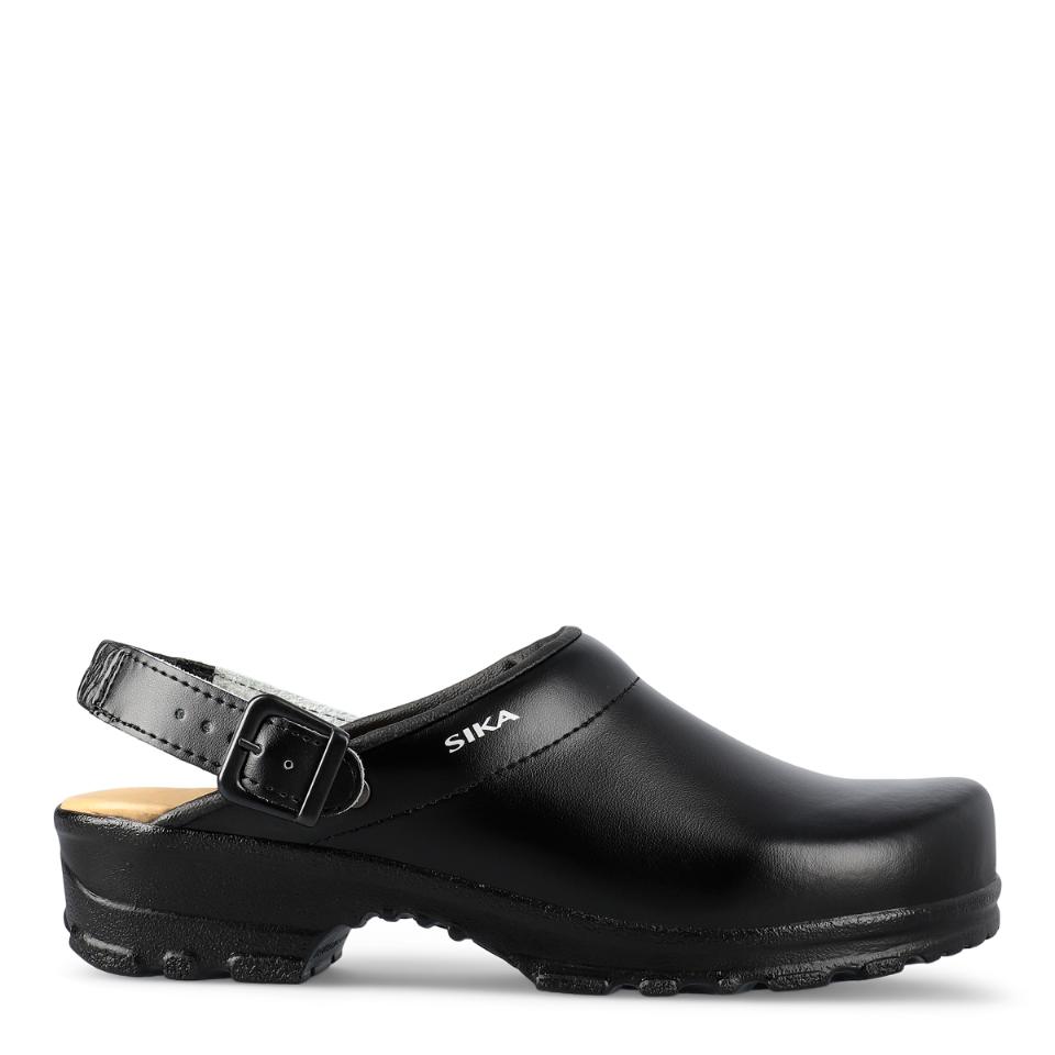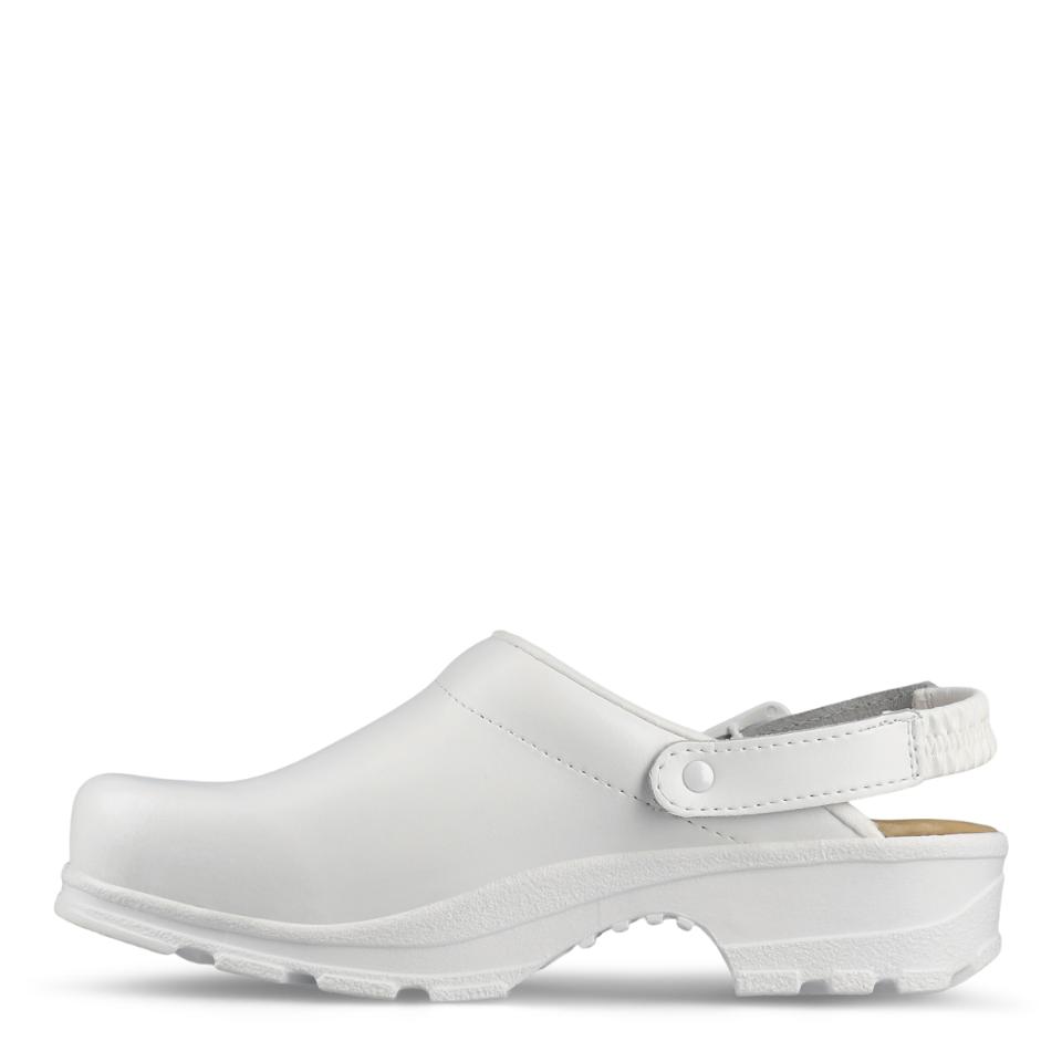 Bekväm och flexibel mjuktoffel med hälrem. Bred passform och god stötabsorbering. Mjuk och extra skön LBS-innersula av skum och läder. Finns i svart och vit