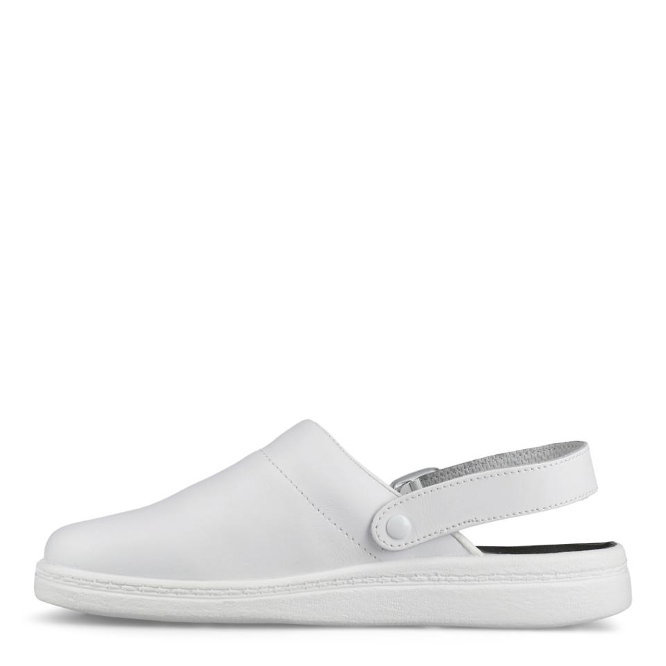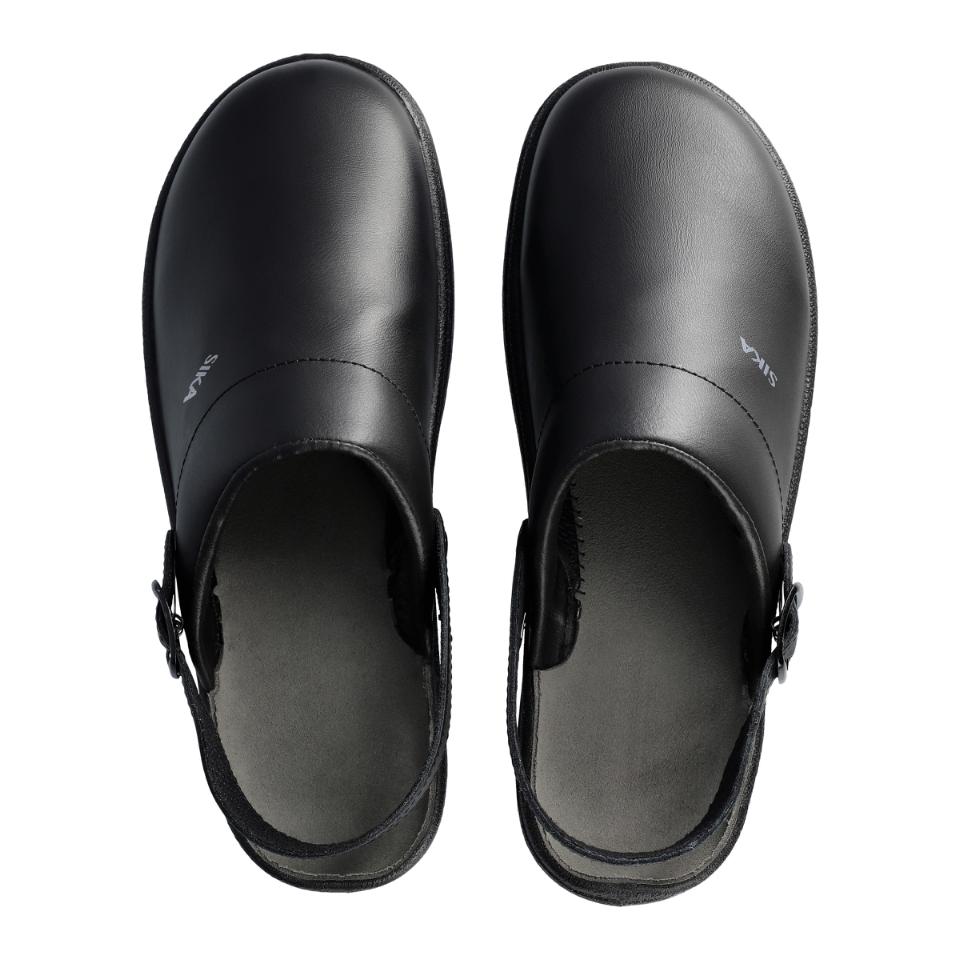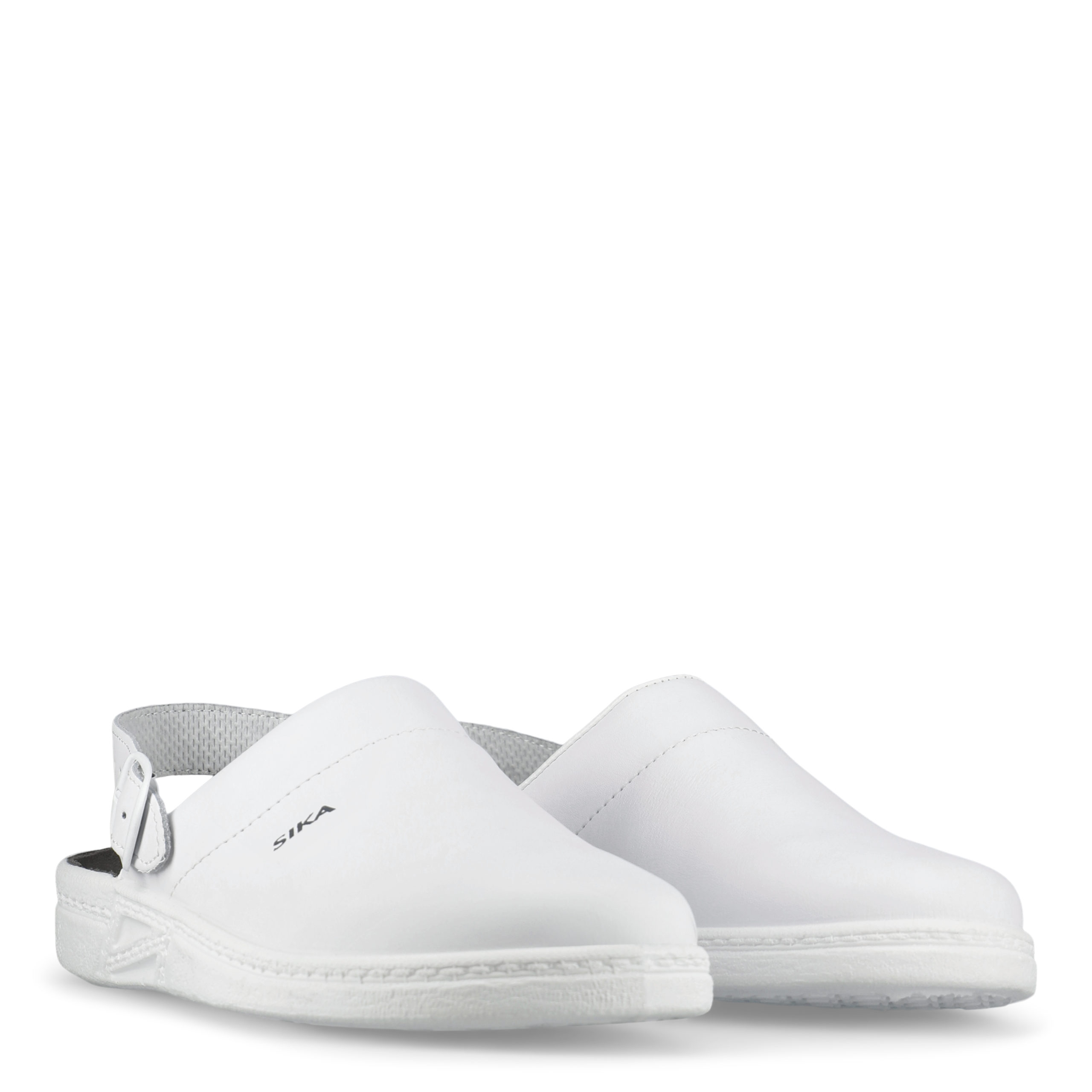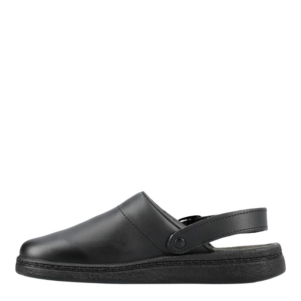 Pantolette med vändbar och justerbar hälrem. Av vattenavvisande läder som andas. Mjuk innersula av mocka. Halkhämmande PU-yttersula. OB+A+E+FO+SRC.