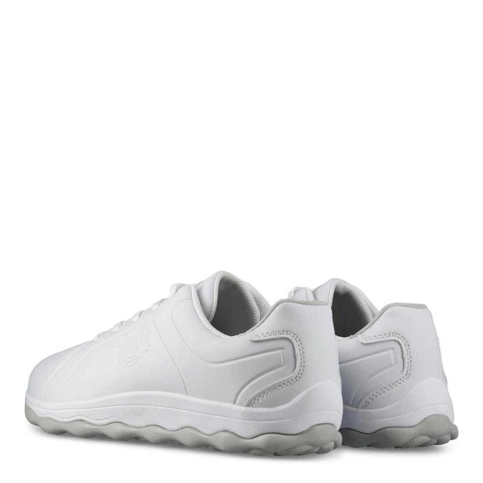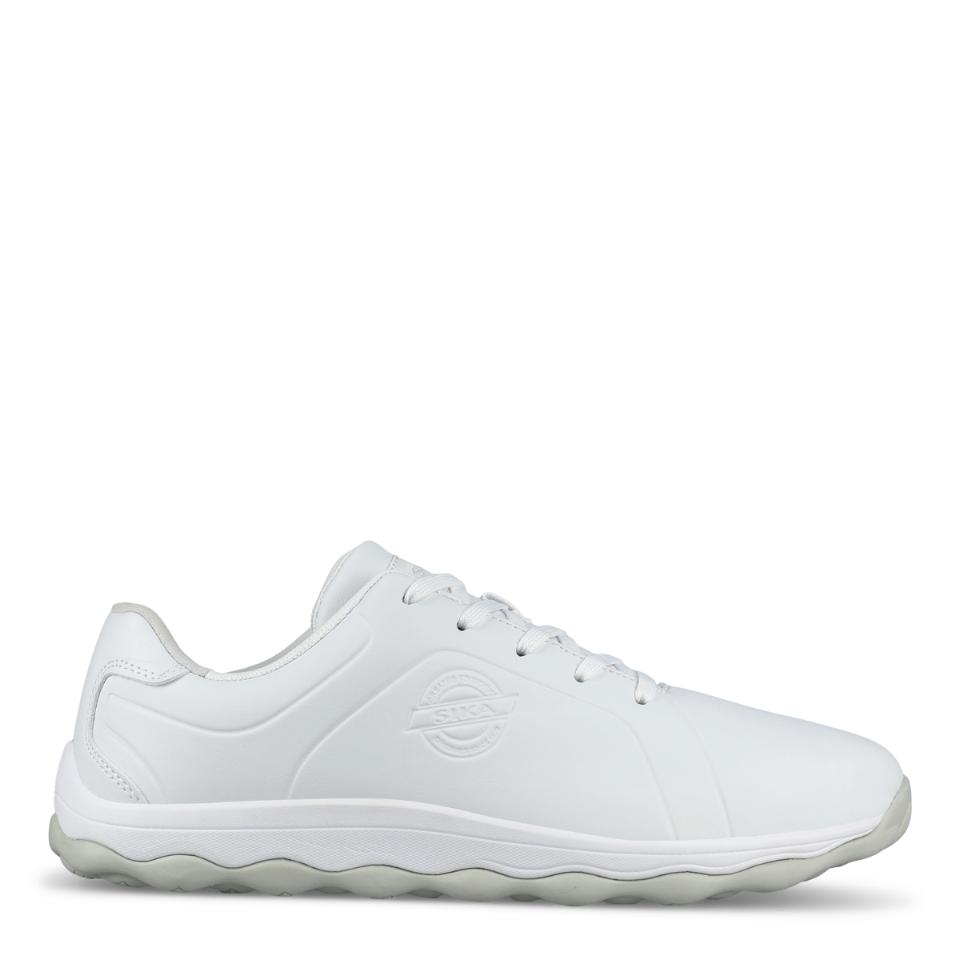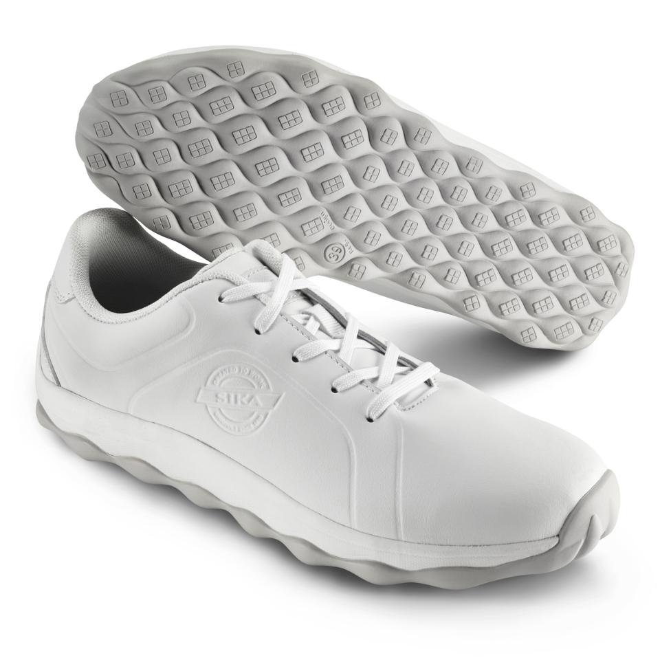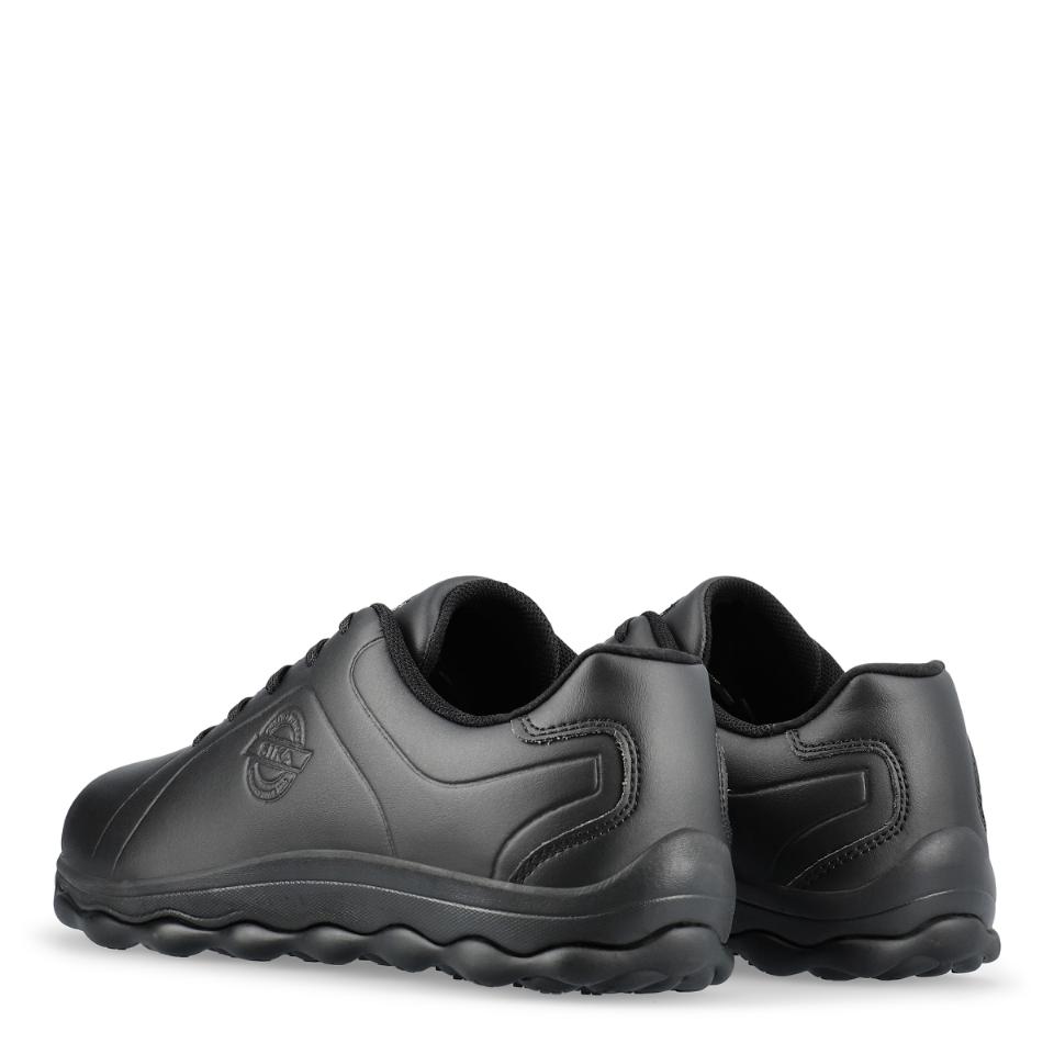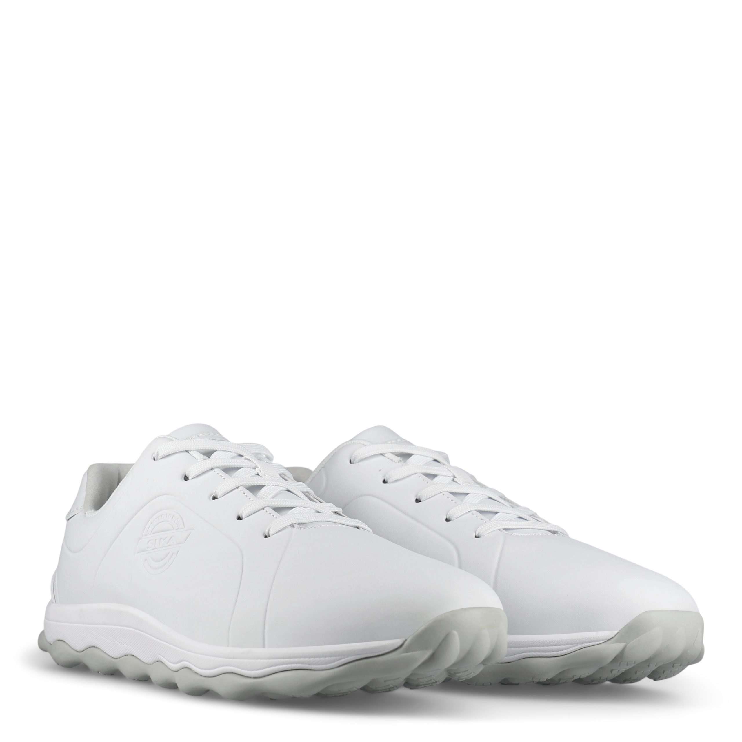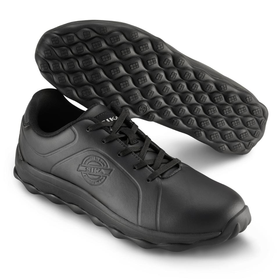 Mycket lätt och bekväm arbetssko designad som en snygg fritidssko. Skorna är av vattenavvisande och slitstarkt mikrofiber som andas. Den specialdesignade yttersulan är extra halkhämmande och ger bra fotfäste på hala ytor. Med luftbubblorna i yttersulan får du samtidigt en unik komfort och stötabsorbering under hela foten så att risken för skador i knä, höfter och rygg minskas. Den stötabsorberande inläggssulan andas, minskar dålig lukt och bevarar det mesta av sin form även vid långvarig användning. Finns i svart och vit och levereras med ett par extra blå skosnören. Metallfri. PVC-fri.
