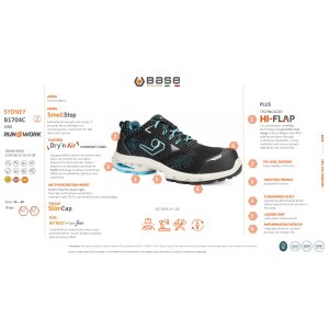 RUN@WORK Sydney work shoe with a technical fabric upper and an anti-odour and antibacterial SmellStop lining, which prevents the proliferation of microorganisms responsible for bad odours and mycosis. Featuring a new Fresh'n Flex Plus Super Light insert, resistant to perforation, which is high performance and ultralight. The SlimCap toe-cap with a thickness of only 6.5 mm is light and more comfortable than a metal toe-cap. It's AirTech+Tpu-Skin anti-fatigue sole features a reduced thickness tread which offers greater elasticity and provides a lasting cushioning effect.