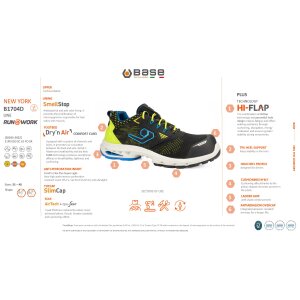 RUN@WORK New York work shoe with a technical fabric upper and an anti-odour and antibacterial SmellStop lining, which prevents the proliferation of microorganisms responsible for bad odours and mycosis. Featuring a new Fresh'n Flex Plus Super Light insert, resistant to perforation, which is high performance and ultralight. The SlimCap toe-cap with a thickness of only 6.5 mm is light and more comfortable than a metal toe-cap. It's AirTech+Tpu-Skin anti-fatigue sole features a reduced thickness tread which offers greater elasticity and provides a lasting cushioning effect.