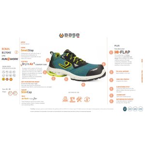 RUN@WORK Roma work shoe with a technical fabric upper and an anti-odour and antibacterial SmellStop lining, which prevents the proliferation of microorganisms responsible for bad odours and mycosis. Featuring a new Fresh'n Flex Plus Super Light insert, resistant to perforation, which is high performance and ultralight. The SlimCap toe-cap with a thickness of only 6.5 mm is light and more comfortable than a metal toe-cap. It's AirTech+Tpu-Skin anti-fatigue sole features a reduced thickness tread which offers greater elasticity and provides a lasting cushioning effect.