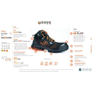 RUN@WORK Paris work shoe with a technical fabric upper and an anti-odour and antibacterial SmellStop lining, which prevents the proliferation of microorganisms responsible for bad odours and mycosis. Featuring a new Fresh'n Flex Plus Super Light insert, resistant to perforation, which is high performance and ultralight. The SlimCap toe-cap with a thickness of only 6.5 mm is light and more comfortable than a metal toe-cap. It's AirTech+Tpu-Skin anti-fatigue sole features a reduced thickness tread which offers greater elasticity and provides a lasting cushioning effect.