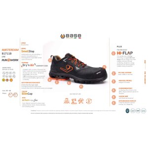 RUN@WORK Amsterdam work shoe with a waxy leather upper and an anti-odour and antibacterial SmellStop lining, which prevents the proliferation of microorganisms responsible for bad odours and mycosis. Featuring a new Fresh'n Flex Plus Super Light insert, resistant to perforation, which is high performance and ultralight. The SlimCap toe-cap with a thickness of only 6.5 mm is light and more comfortable than a metal toe-cap. It's AirTech+Tpu-Skin anti-fatigue sole features a reduced thickness tread which offers greater elasticity and provides a lasting cushioning effect.