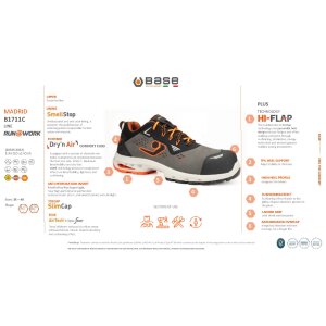 RUN@WORK Madrid work shoe with a suede leather upper and an anti-odour and antibacterial SmellStop lining, which prevents the proliferation of microorganisms responsible for bad odours and mycosis. Featuring a new Fresh'n Flex Plus Super Light insert, resistant to perforation, which is high performance and ultralight. The SlimCap toe-cap with a thickness of only 6.5 mm is light and more comfortable than a metal toe-cap. It's AirTech+Tpu-Skin anti-fatigue sole features a reduced thickness tread which offers greater elasticity and provides a lasting cushioning effect.