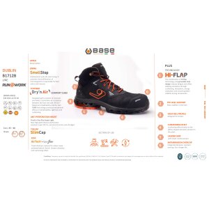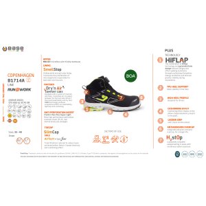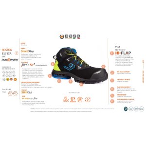 RUN@WORK Boston work boot with a microfibre upper and an anti-odour and antibacterial SmellStop lining, which prevents the proliferation of microorganisms responsible for bad odours and mycosis. Featuring a new Fresh'n Flex Plus Super Light insert, resistant to perforation, which is high performance and ultralight. The SlimCap toe-cap with a thickness of only 6.5 mm is light and more comfortable than a metal toe-cap. It's AirTech+Tpu-Skin anti-fatigue sole features a reduced thickness tread which offers greater elasticity and provides a lasting cushioning effect.